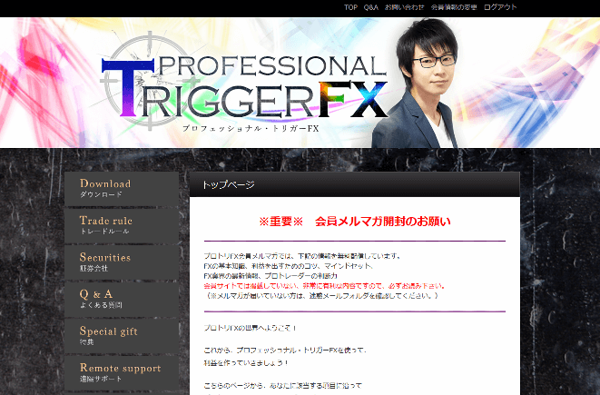 プロフェッショナル・トリガーFXを購入すると、以下のような購入者サイトにアクセス出来るようになります。