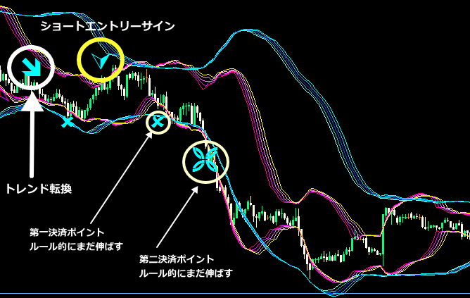 このチャートの場合は、第二決済ポイントでも利食いはせずに伸ばす判断になります。