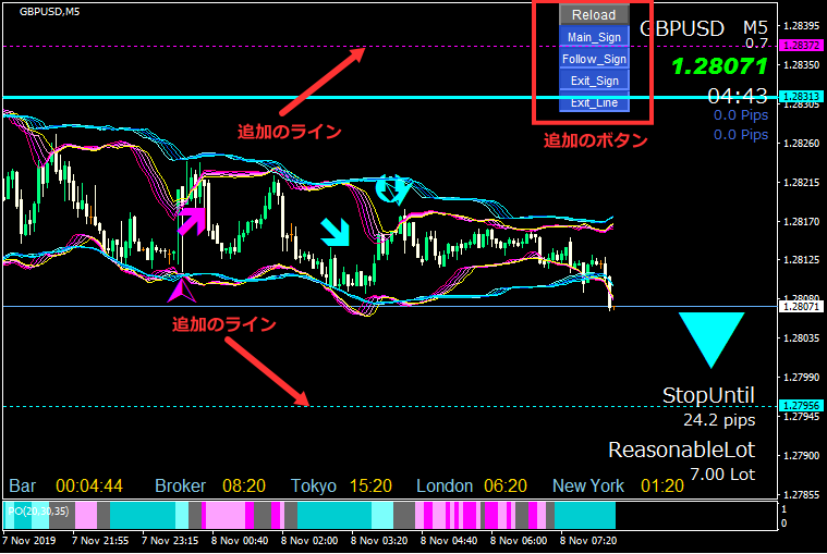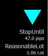 損切り幅については、チャート右下のStop Untilにて示されており、この損切り幅から適切なロット計算までしてくれます。(ロットの計算は変更可)