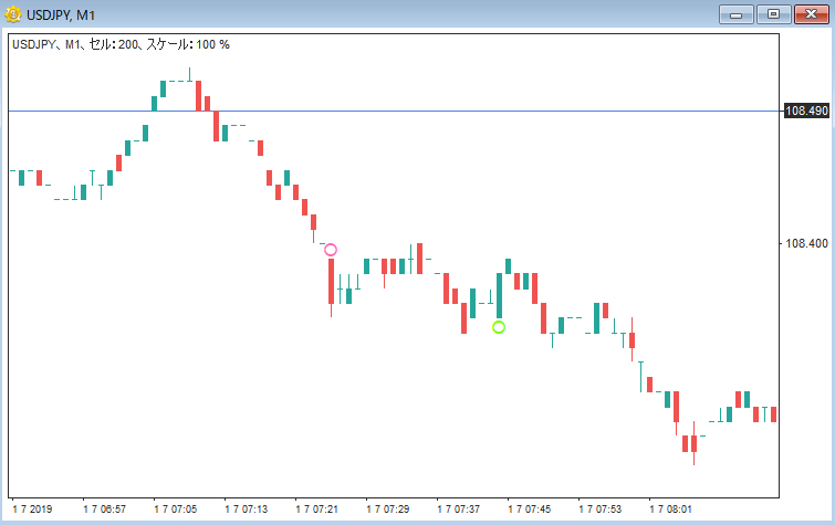 大きな注文が入ると、それを反映して1分足レベルでは大陽線や大陰線が出現します。