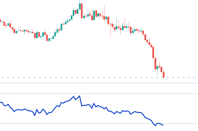 このチャートの右端ではRSIが20のラインを割っています。