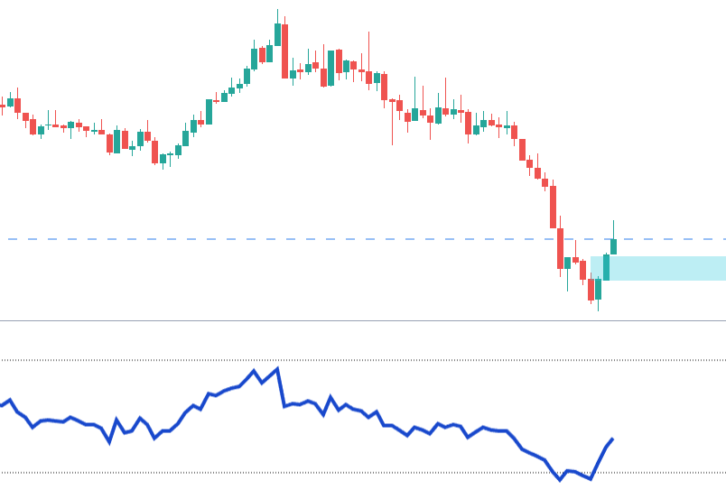 RSIが20になるまで下げた後にFVGを伴う強い反発の上昇が生じる。