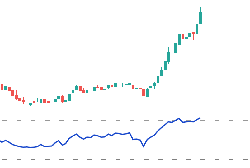 RSIが20を割るのと同じく、RSIが80を超えることは珍しいです。
