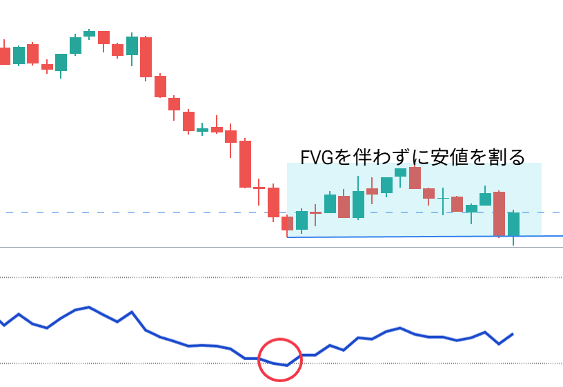このチャートではRSIが20を割ってから一時的に反発していますが、その流れ(青い水色のゾーン)を見ると上昇のFVGは一切出ていません。