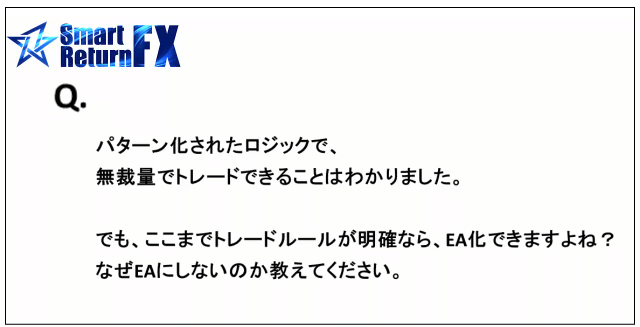 スマプロのロジックが本当に凄くて、無裁量でトレードして年間17,000pips、勝率8割が達成できるのであれば、ぜひともEAして欲しいと考えるのは私だけではないはずです。