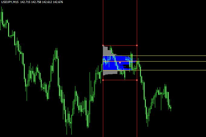 インジケーターによって集計期間が決まっているものもありますが、今回は自由に指定できる無料MT4インジの「Volume Profile Draggalbe」を利用して解説していきます。