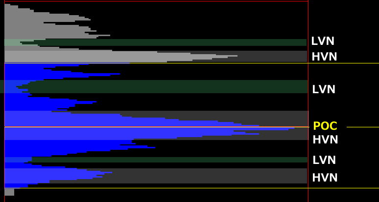 LVNは、取引量が少ない価格帯で、ボリュームプロファイルの中でも特に目立った「谷」の部分になります。