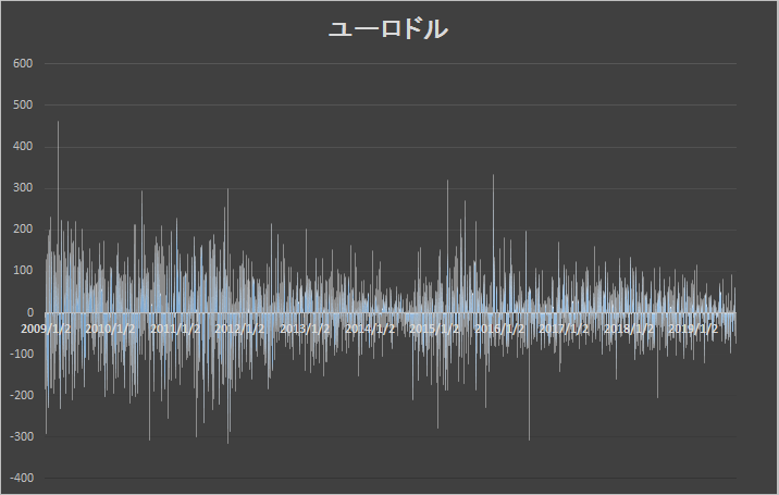また、この間ではユーロドルはかなり下落しましたが、それでも陰線と陽線の比率や平均の値幅に違いはありませんでした。