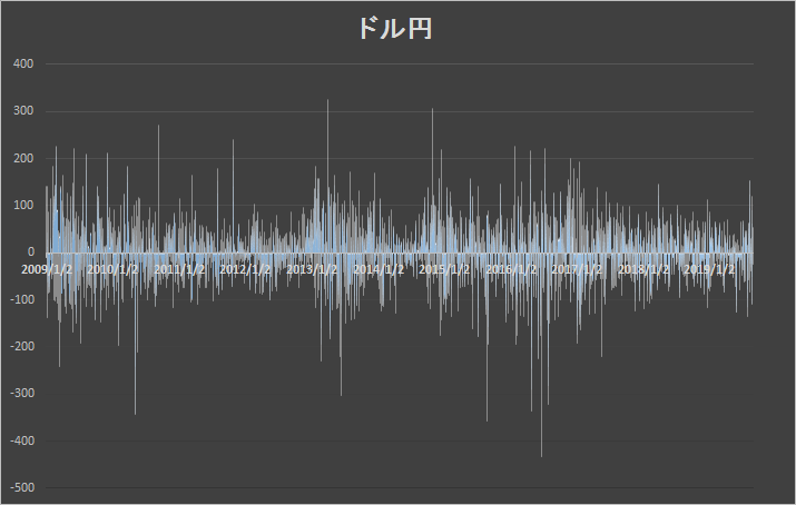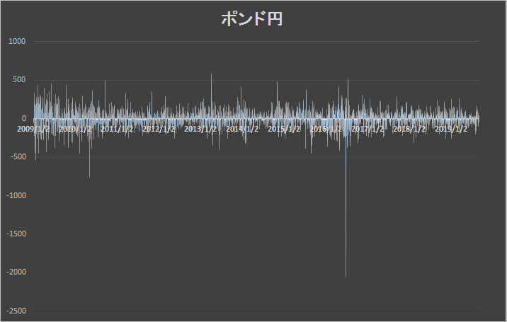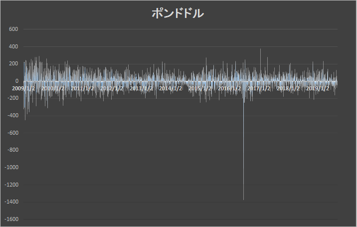 ポンドドルもブレグジットショック時の下げが目立ちますが、他の通貨ペアと同様に陰線と陽線では値幅に違いはありませんでした。