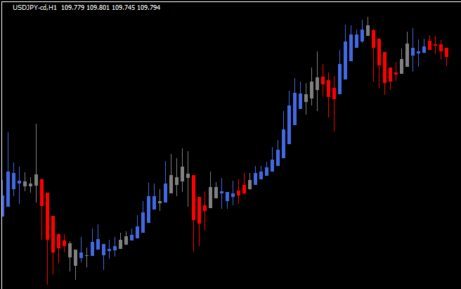 Zone Tradeは、上昇トレンド、下降トレンド、レンジを示すインジで、HeikinAshiZoneTradeでは、平均足が陽線や陰線であってもZone Tradeがレンジならば色が灰色に変わります。