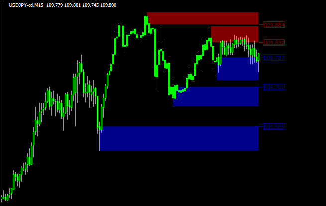 サポートが青色、レジスタンスが赤色で非常に見やすく、良いポイントにゾーンが表示される優秀なインジです。