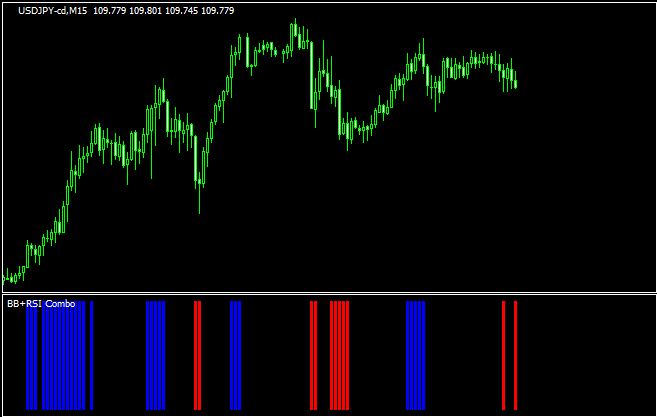 ボリバンとRSIを組み合わせて、条件が揃ったときにチャート下にバーが表示されるインジです。