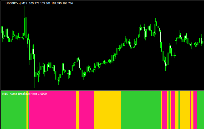 具体的には、ローソク足が雲よりも上にあれば緑色、雲より下にあれば赤色、ローソク足の終値が雲の中にあれば黄色で表示されます。