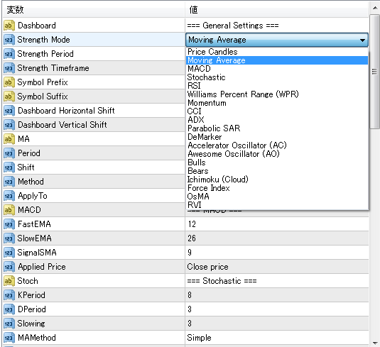 このインジの凄いところは、通貨の強弱の計算方法や時間軸を自分で細かく設定できる点にあります。