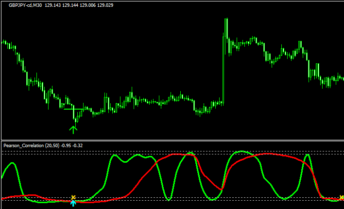 スムーズド化したRCIが2本表示され、それらが同時に上限や下限に揃った時にサインが表示される逆張り型のインジです。