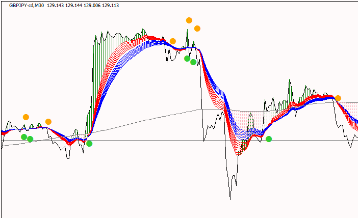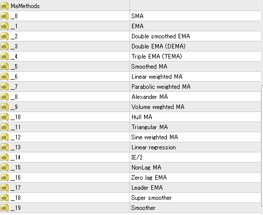 ぱっと見ではトレンド方向が変わると色の変わるインジですが、かなり多くの平均の計算方法が指定できる有能インジです。