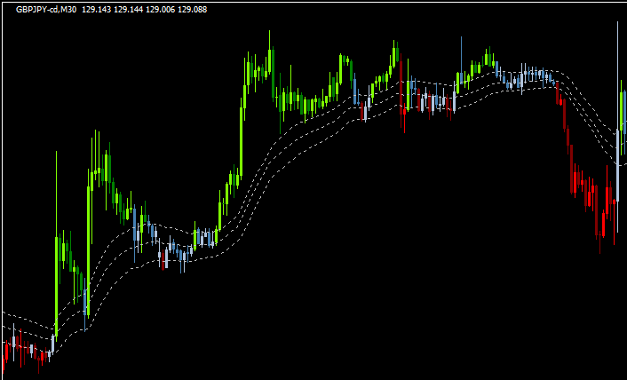 トレンド方向によってローソク足の色を変えるインジと、押し目・戻り目となりやすいバンドを示すインジから構成されるインジセットです。