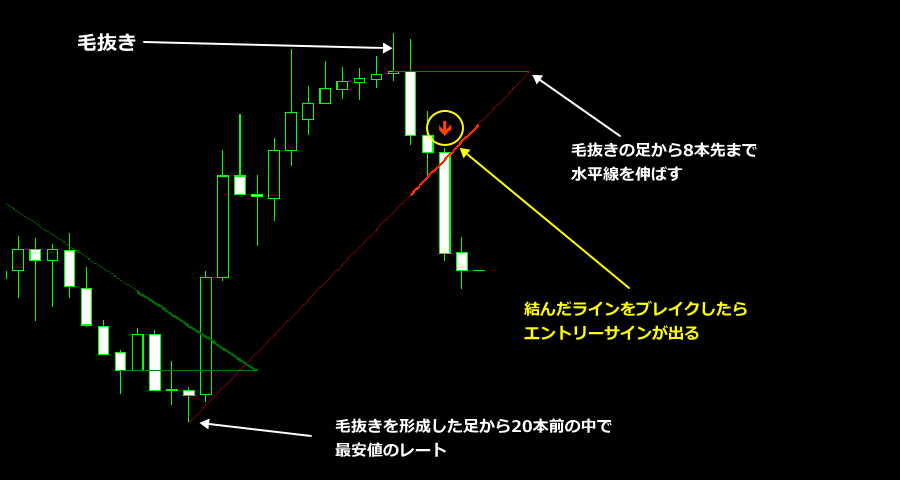 天井や底となりやすい「毛抜き天井・毛抜き底」とラインを組み合わせてサインを出すインジです。
