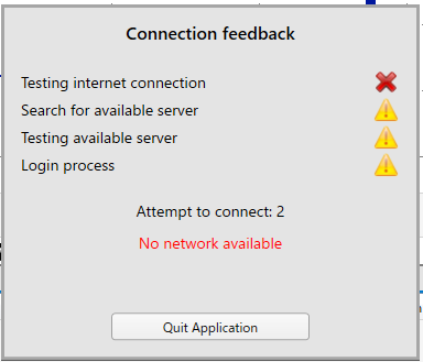 しかし、Think Traderではソフト起動中にネット回線を切断すると下のような表示が出て、回線がつながるまで操作を受け付けなくなります。