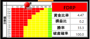 練習君2には、販売元の提唱する「Forex Dogの破産確率」を計算する機能が付いており、それまでの検証で、どれくらいの確率で破産することがあるのかをリアルタイムで求めてくれます。