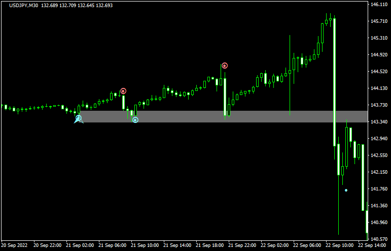 そこで、今回はタートル・スープのエントリーポイントをベースとしてオーダーブロック候補を表示するインジケーター(Turtle-Soup-OBIM)を作成しましたので、検証していきたいと思います。