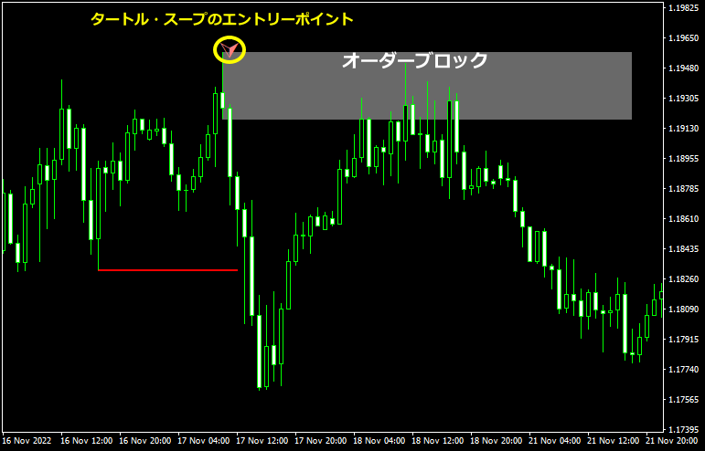具体的には、タートルスープのエントリーポイントは、スマートマネーが流動性を得るためにストップ狩りを行った価格帯となります。