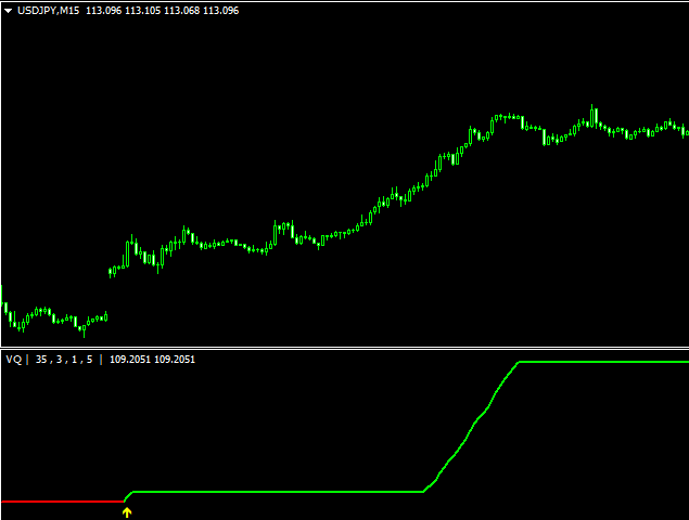 それでも情報を集めていると、Forex Factory内にて(35.3.1.5)が良いと書かれているのを見てEA化してみました。ちなみにこのパラメーターでVQを表示させると以下のようになります。35期間なので、シグナルの頻度はかなり少ないです。