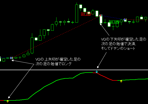 VQのシグナルが出るたびに現在のポジションを決済して新たにポジションを取るドテンルールになります。チャートにすると以下のようになります。
