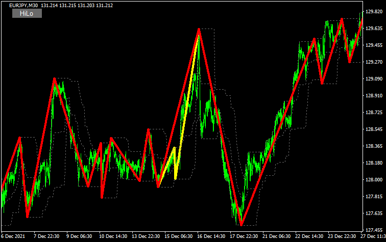 下のチャートはデフォルト設定のZigZagと12期間のハイローバンドを一緒に表示したものです。ローソク足が上バンドにタッチしたら波が上に切り替わり、下バンドにタッチしたら波が下に切り替わっているのが分かります。