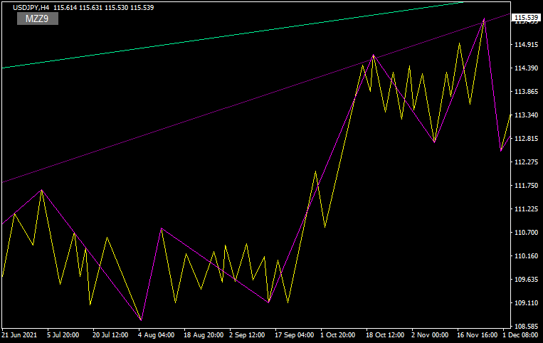 - 黄色いZigzagは30期間の高値や安値のブレイクかつ、前の頂点や底から3本以上続いていれば波が切り替わります。