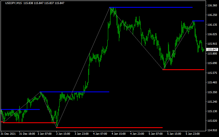ZigZagの頂点や底からサポレジラインを描画するインジです。